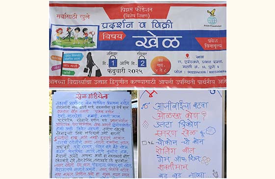 प्रिझम फौंडेशन मध्ये 'खेळ' या मुलांच्या जिव्हाळ्याच्या विषयावर दि. 01 व 02 फेब्रुवारी 2025 रोजी प्रदर्शन भरविण्यात आले होते. प्रिझम फौंडेशन संचलित फिनिक्स, लार्क, माधवी ओगले व्यावसायिक शाळा व बेनू प्रशिक्षण केंद्र अशा चारही विभागाचे सर्व विद्यार्थी, विश्वस्त, शिक्षक व स्टाफ, पालकांच्या मदतीने हे प्रदर्शन साकार झाले.