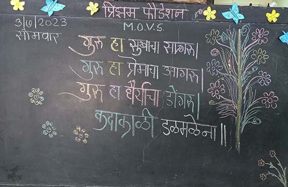 शाळेत सोमवारी दि. २२ - ०७ - २०२४ रोजी गुरुपौर्णिमा दरवर्षीप्रमाणे उत्साहात साजरी करण्यात अली. विद्यार्थ्यांना मानवी जीवनातील गुरूंचे महत्व समजावे यासाठी या कार्यक्रमाचे आयोजन केले होते. विद्यार्थ्यांनी आपल्या गुरूंना नृत्यातून गुरुवंदना दिली. विद्यार्थ्यांनी श्लोक, गुरुपौर्णिमेची माहिती, समुहगीत, गुरु-शिष्याच्या गोष्टी, तबला वादन, नाटक असे कार्यक्रम सादर केले. तसेच काही शिक्षकांनी गुरु-शिष्याच्या गोष्टी व गाणी सादर केली. कार्यक्रमाला संस्थेचे व शाळेचे सर्व मान्यवर, शिक्षक व सेविका उपस्थित होत्या.