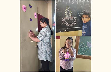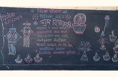 प्रिझम फाऊंडेशन मध्ये शनिवार दि. 11/10/2025 रोजी दिवाळी साजरी करण्यात आली. तिन्ही शाळेतील विद्यार्थ्यांनी शिक्षकांच्या मदतीने फलक लेखन केले, आकाशकंदील बनविले, ग्रीटिंग कार्ड तयार केले, वर्ग सजावट केली, रांगोळ्या काढल्या. दिवाळीच्या प्रत्येक दिवसाची प्रतिकृती तयार केली होती त्याचे महत्व शिक्षकांनी विद्यार्थ्यांना सांगितले.